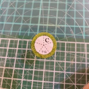 花びらを葺くのが苦手な人は、中心がしっかり見えていないことが多いです。5枚の花びらの先がしっかり同じ点に向かって配置されていないと、きれいな形を作ることはできません。土台の円をコンパスで描く場合は、円の中心に針の跡がつくので、それを利用すると良いでしょう。布で隠れる場合は、中心にペンなどで印をつけると分かりやすいと思います。