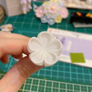 頑張って形を整えようとして、せっかくつまんだ花びらが崩れてしまった!なんてことは、つまみ細工をやったことがある人は多分みんな経験していると思います。微調整は必要ですが、5枚を土台の上に配置した後は大きく動かさない方が良いです。下手に動かしてしまうと、変なところにボンドがついてしまって花びら同士がくっついたり、形が変形したまま固まったりと、修正がきかなくなってしまうことが多いです。
