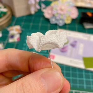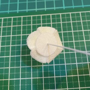 花びらをつまむ際、特に丸つまみは、先が尖りすぎないよう、ボンドのつけすぎに注意です。底の方に少しずつつけるのが良いと思います。一越ちりめんはボンドがよくつくので、少量でもけっこうくっつきます。ここに注意すると、お花の形にした時に中心まできれいに仕上げることができます。