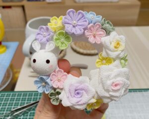 つまみ細工といえば七五三や成人式の髪飾りのイメージが強いと思います。実際に私も、つまみ細工=「ちりめん」「和風」と思っていましたが、実は使う生地によって、和風にも洋風にもアレンジすることができます。