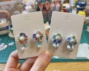 リバティの生地でイヤリング。柄物を使っても可愛いです。リバティのタナローンは可愛くておススメです!小さい作品を作るときは、柄も細かいものを選ぶと良いでしょう。