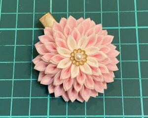 ちりめんと比べるとシャープな感じになっています。これだけだとシンプルですが、ローンで作ったつまみ細工は洋風のアクセサリーにぴったりです。