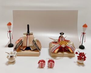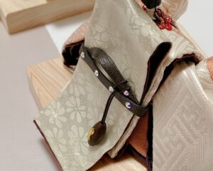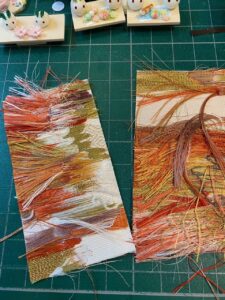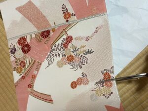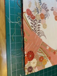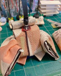 男雛も同じ帯を使いましたが、柄のない部分を切り出したので、女雛より下処理は楽でした。
