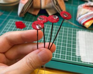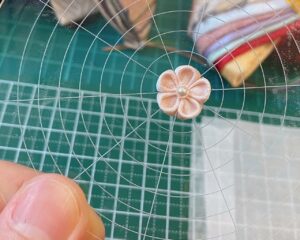 つまみ細工で作ります。枝っぽく見えるようにワイヤーに茶色のフローラルテープを巻きました。土台と花びらの色は、基本的には一緒にしています。