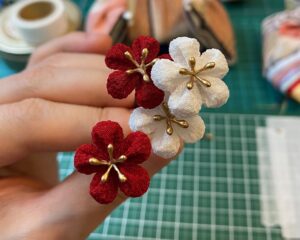 こちらの生地はちりめんより厚手でハリがあって、小さいつまみ細工はけっこう大変でした。