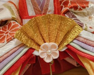 扇に飾るお花は1㎝角の正絹で作りました。これも何かの着物の端切れと思われます(もはや分からず)